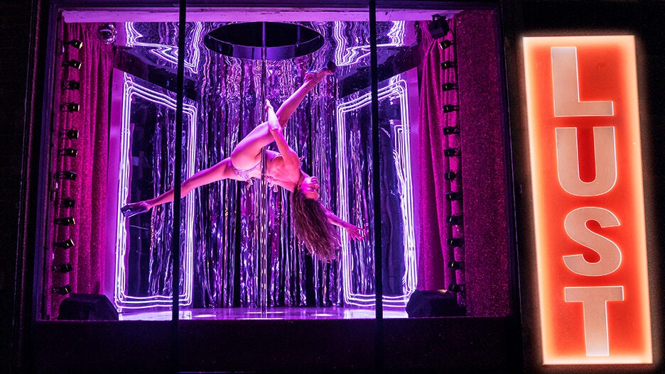 Three times a night, theatergoers are divided into three groups, handed headphones and steered toward a series of outdoor rows of chairs where two actors perform behind glass. The concept for the shows — modern takes on the classic Seven Deadly Sins — is at once inviting and clichéed for a neighborhood known for sex dungeons and other risqué activities in its pre-gentrified days.