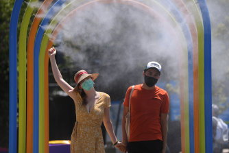 Finding somewhere to cool down has been important, as Ines Venencie and Daniel Suarez found out at the tennis.Credit:Eddie Jim