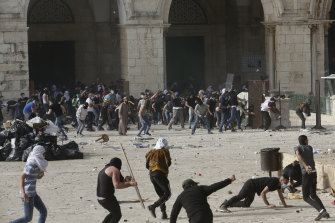 Palestinians clash with Israeli security forces at the Al Aqsa Mosque compound on Monday.Credit:AP