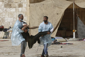 A wounded man is evacuated during clashes at the Al-Aqsa Mosque compound.Credit:AP
