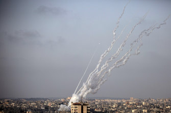 Rockets are launched from the Gaza Strip towards Israel on Monday.Credit:AP
